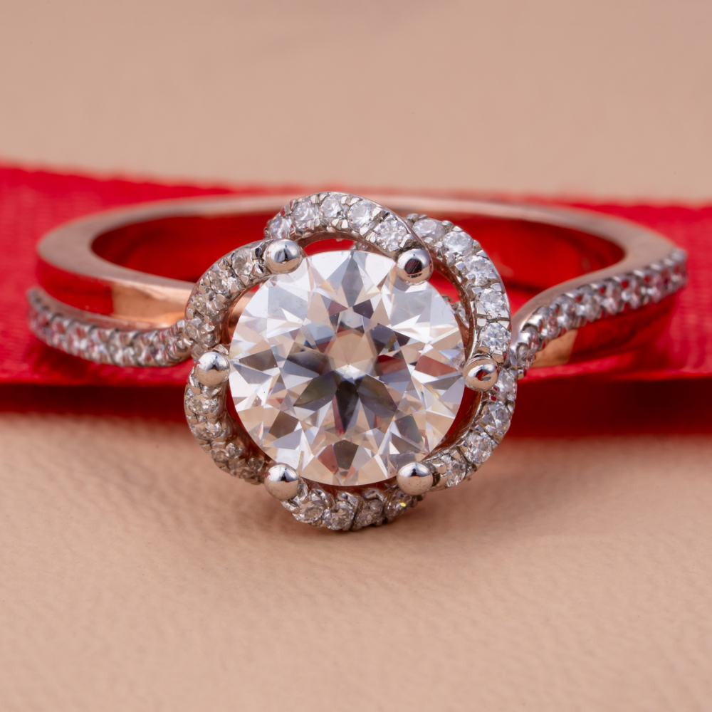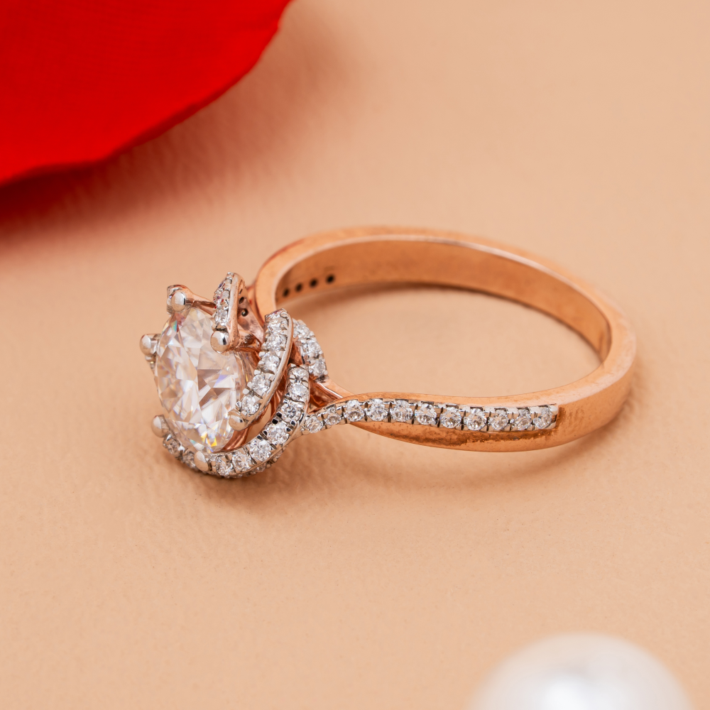 A breathtaking rose gold ring with a brilliant diamond centerpiece encircled by a double halo of smaller stones for ultimate sparkle.