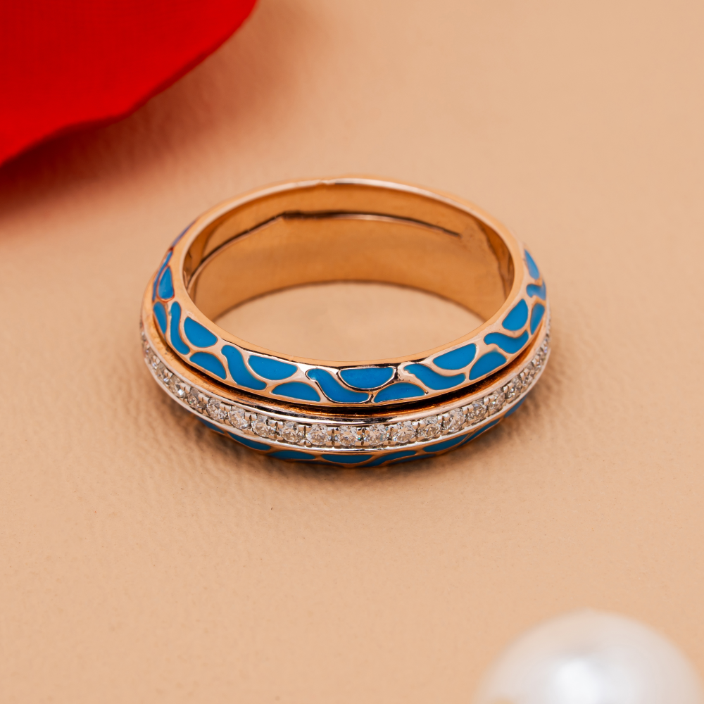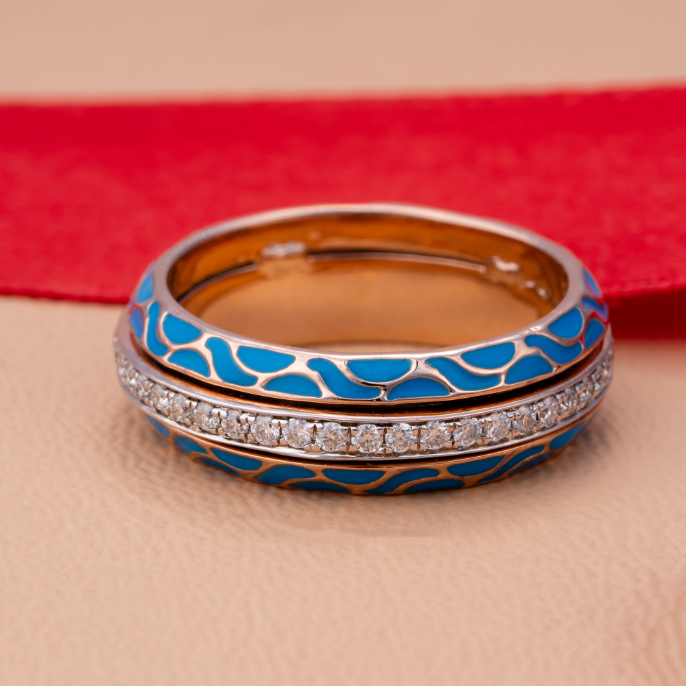 A modern rose gold ring with a blue enamel pattern and pavé diamond centerpiece.
