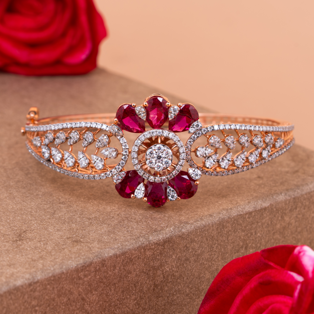 A vibrant ruby and diamond bangle designed in a floral bloom motif, set in rose gold to express timeless romance and elegance.